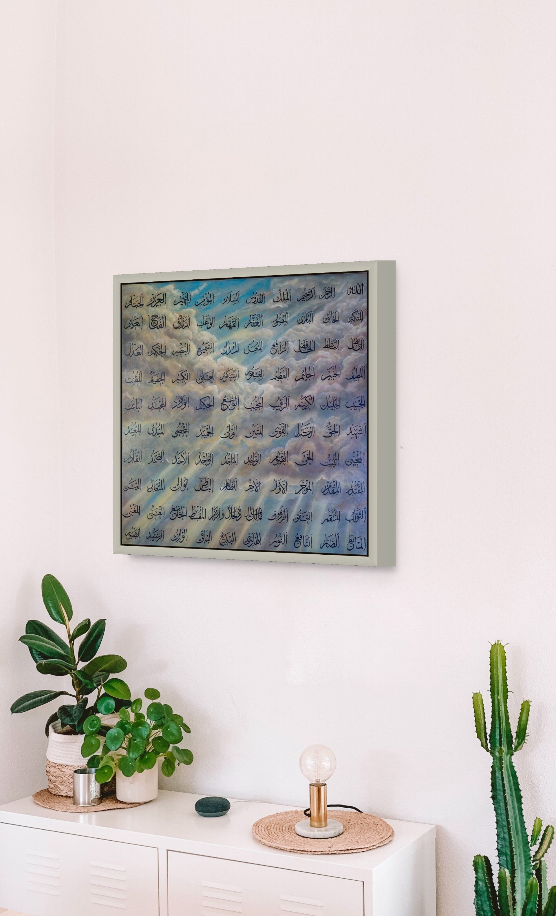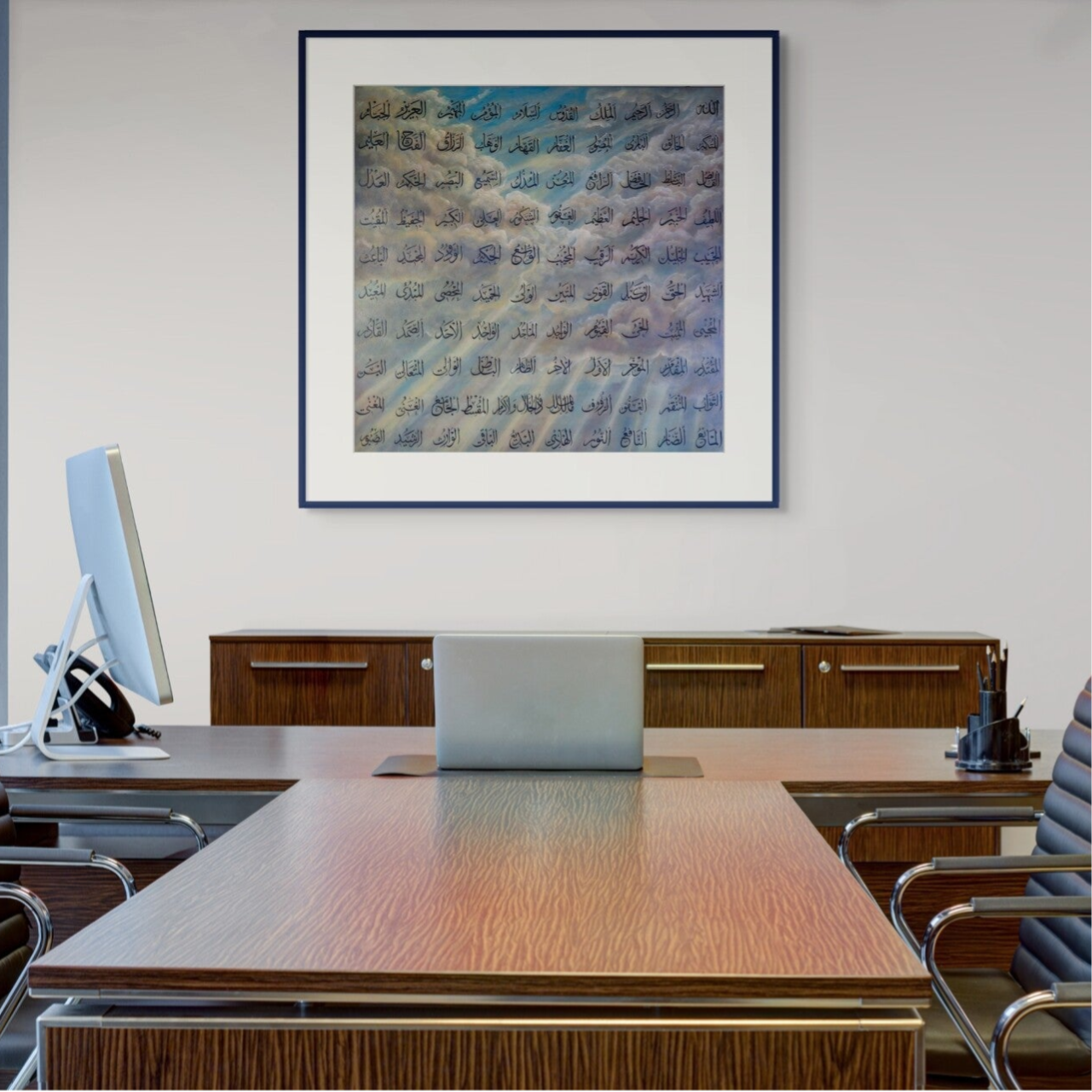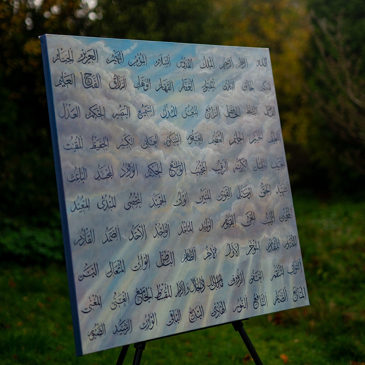 Names of Allah - Clouds print of an original oil painting depicting 99 glorious names of Allah SWT.