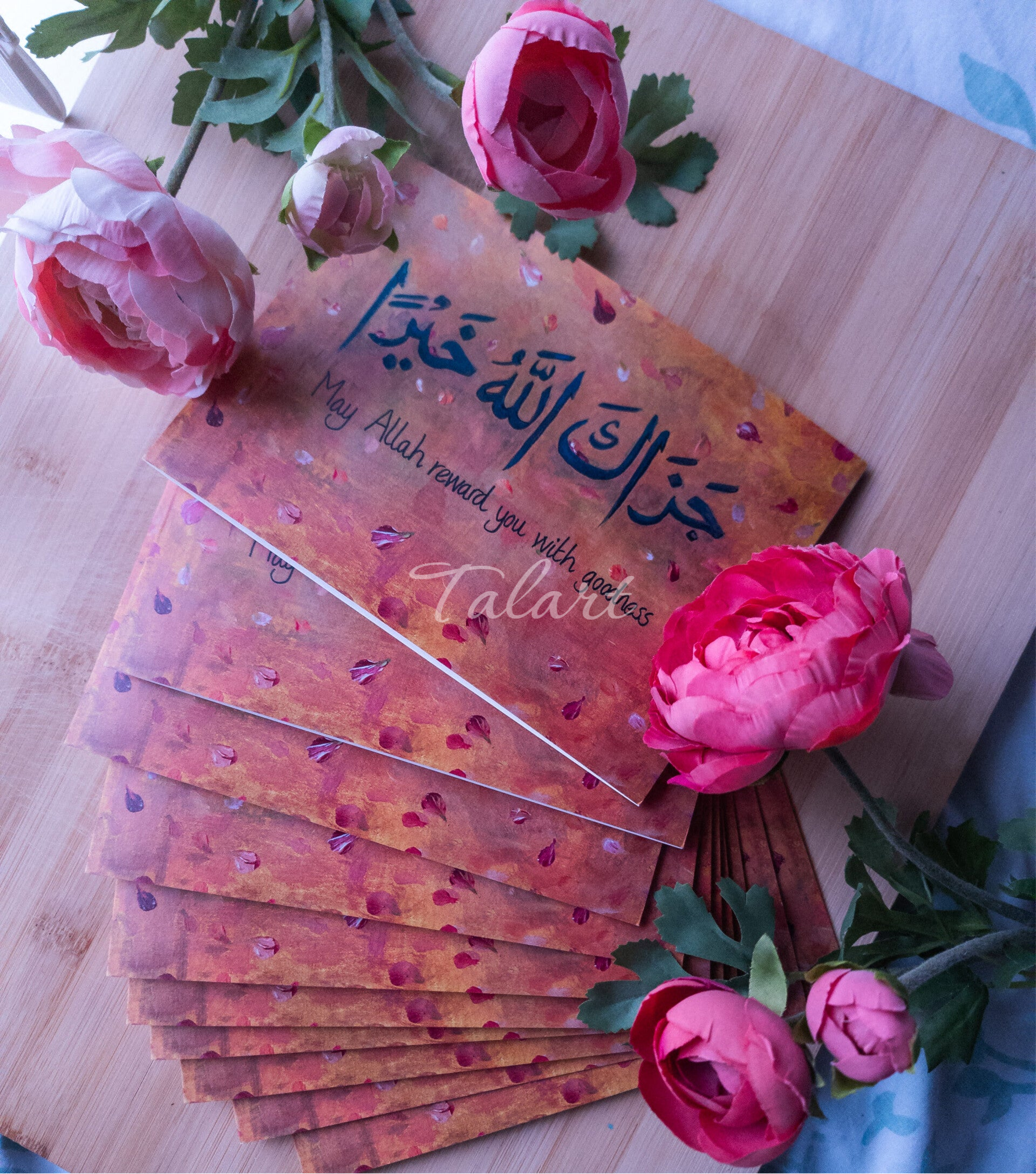 Thank you card 'JazakAllah khairan' is a print from a painting. Translated, May Allah reward you with goodness.