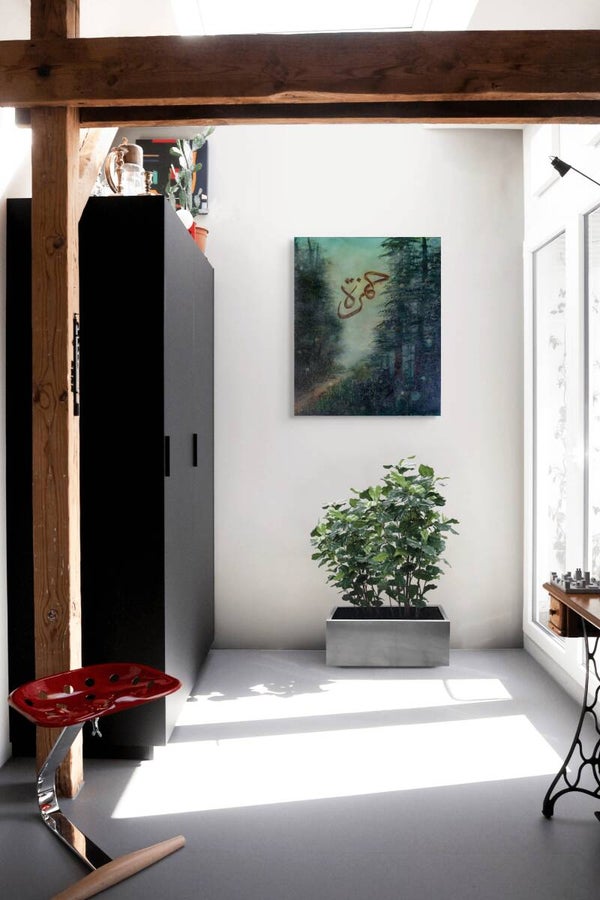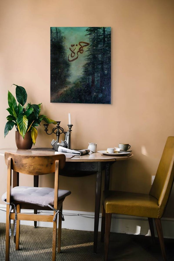 Original painting of the name Hamzah above a path through a mysterious fantasy forest. Moody trees and glittery will o'the wisps look on.