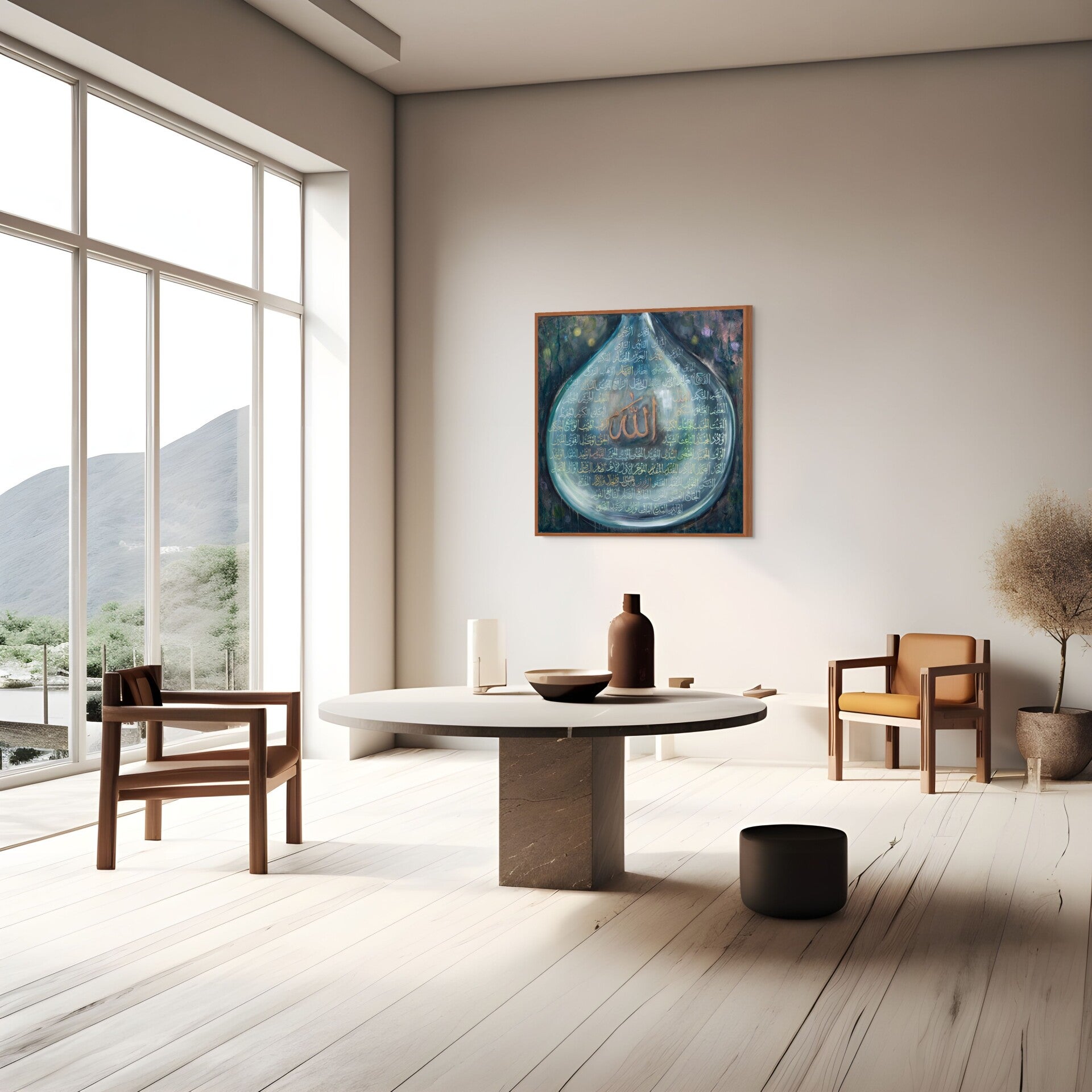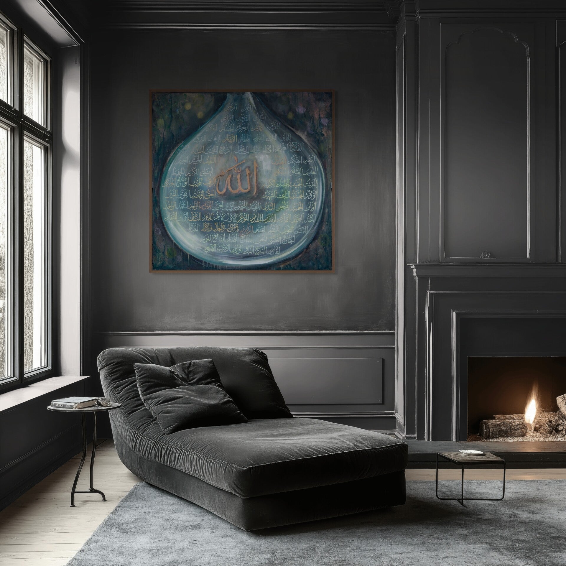 Introducing an exceptional piece of artwork that will elavate your interior. A strong statement piece that will captivate you with the hand painted names of Allah. There is texture and sparkle created with mica and acrylic mediums. This painting will speak to your soul.