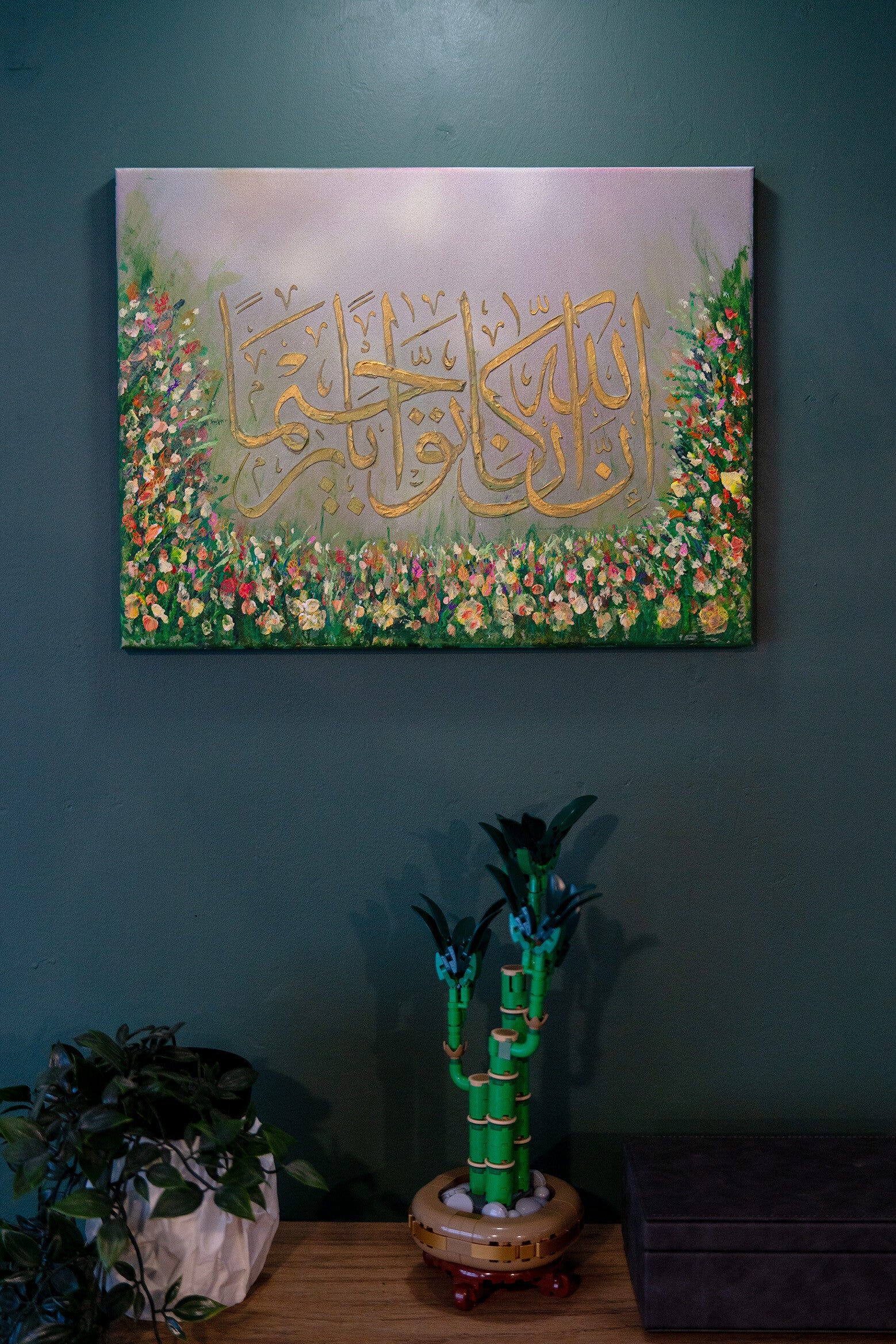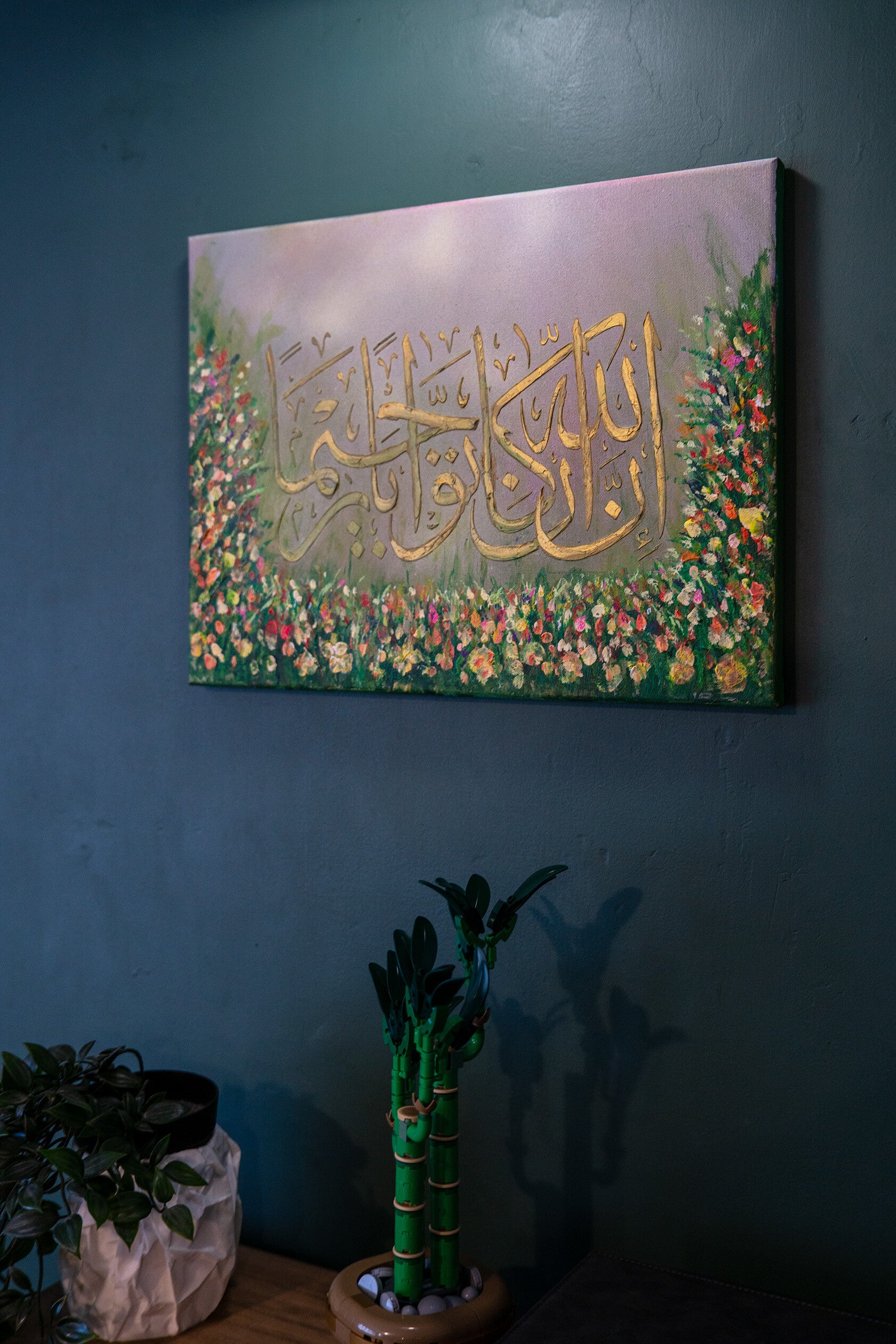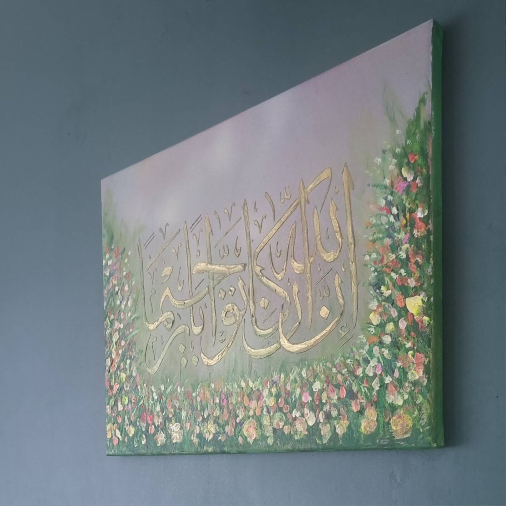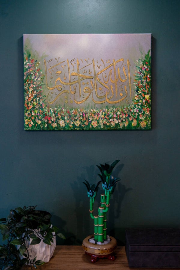 Serene Forgiveness acrylic painting 41cm x 31cm approx Arabic calligraphy 'Innal laaha kaana Tawwaabar Raheema' 'Indeed, Allah is ever Accepting of repentance and Merciful' Surah An-Nisaa 4:16